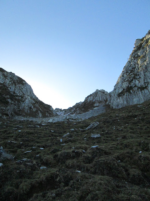 Départ à 8H55 du carrefour des pistes après le port de Castet à 920m. Il faut suivre la piste jusqu'aux cabanes d'Escala. C'est assez long et pas passionnant mais bon il faut le faire. On peut couper avant les lacets de la piste mais ça ne fait pas gagner grand chose. Après les cabanes au niveau d'un virage en épingle sur la gauche une vague sente file à doite. Là elle se perd un peu mais semble filer toujours sur la droite. Moi je contourne une bosse par la gauche puis vise un petit col vers 1550M . Je rejoins ensuite en filant sur la droite , la base du couloir menant au col de Lallène vers 1600M. Là j'accélère et accède vite à ce dernier par une sente à gauche , il est 10H20. Petite pause avant de prendre à gauche. Là j'hallucine le temps est splendide, on est un 16 Novembre et je suis en short et débardeur!!!!